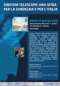 Domani sabato 31 gennaio, a partire dalle ore 10:00, la sede dell’Associazione dei sardi “Sebastiano Satta” di Verona ospiterà un incontro dedicato alla presentazione del progetto Einstein Telescope e delle attività in corso nel sito candidato di Sos Enattos. Dopo i saluti di apertura di Giuseppe Cuccuru, presidente dell’associazione, interverranno Andrea Contu (ricercatore INFN e responsabile ET Sardegna) e Davide Rozza (ricercatore Università Milano-Bicocca e INFN). Modera Matteo Serra (INFN, comunicazione ET Italia).